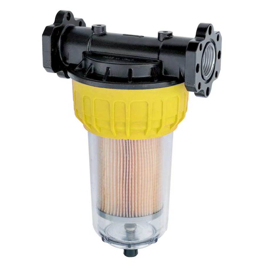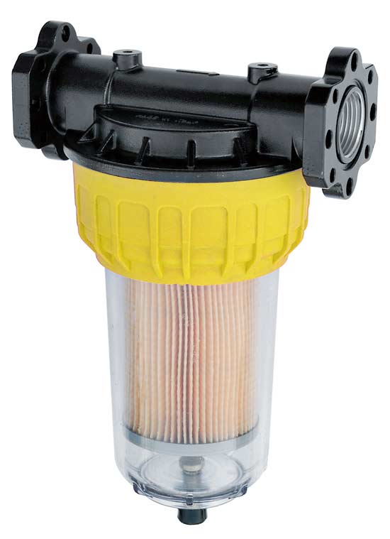 Cartridge filter with transparent container and removable inner cartridge can be applied on both suction and delivery. They are available with water absorbing cartridge or with cartridge. The amount of impurities or water present are immediately visible in the transparent container. Any water or impurities are cleaned out by a valve set in the bottom of the container.