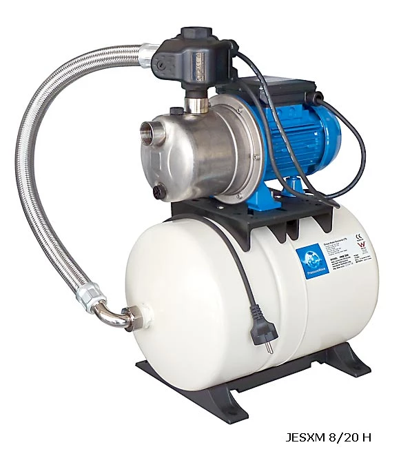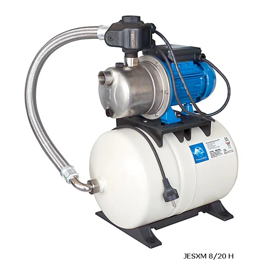 Хидрофорната система JESXM 8 е готов за монтаж комплект. Състои се от помпа, разширителен съд, пресостат с манометър и мека връзка. Пресостата е настроен съгласно параметрите на помпата. Входа и изхода на хидрофора са с присъединителен размер 1". Хидрофора JESXM 8 е подходящ за захранване на еднофамилни къщи и вили.