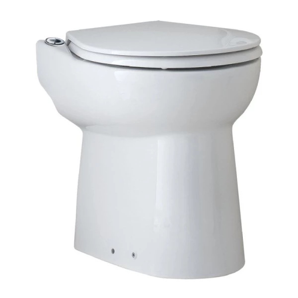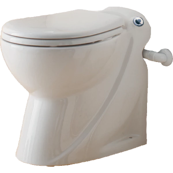 Тоалетна чиния с вградена помпа с режещ механизъм. Не се нуждае от тоалетно казанче, тъй като системата за изпускане на водата е вградена. Вертикално изпомпване: 3 метра.