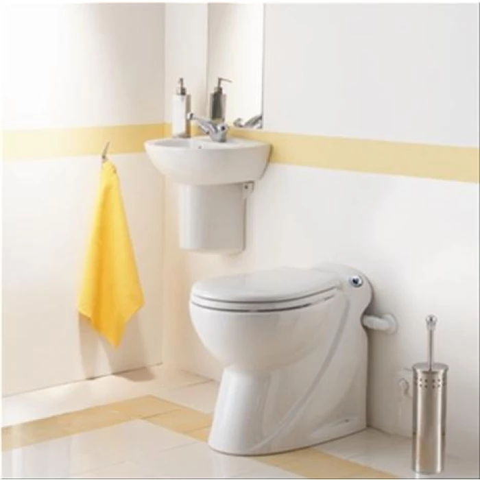 Sanicompact PRO е комфортна и стилна тоалетна чиния с вградена помпа с режещ механизъм. Тя не се нуждае от тоалетно казанче, тъй като системата за изпускане на водата е вградена. Предназначена е за инсталиране на тоалетни и мивки дори и в тесни и ограничени пространства във всеки дом.